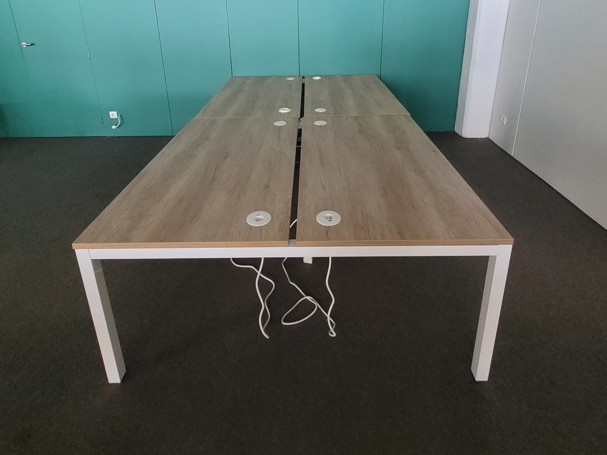 Ces postes partagés sont disponibles dans différentes dimensions (2, 4, 6, voire 8 personnes), avec options de cloisons de séparation, prises intégrées, ou chemins de câbles, pour un espace de travail optimisé et organisé.