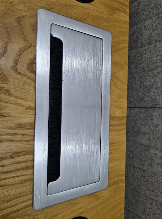 - Tablette : bois type chêne, équipée d’une trappe en acier et de prises électriques