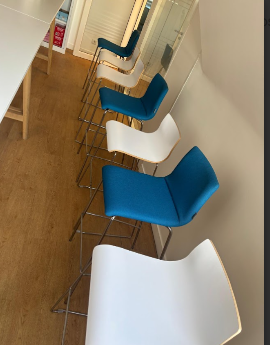 - Assise confortable, rembourrée et recouverte de tissu bleu